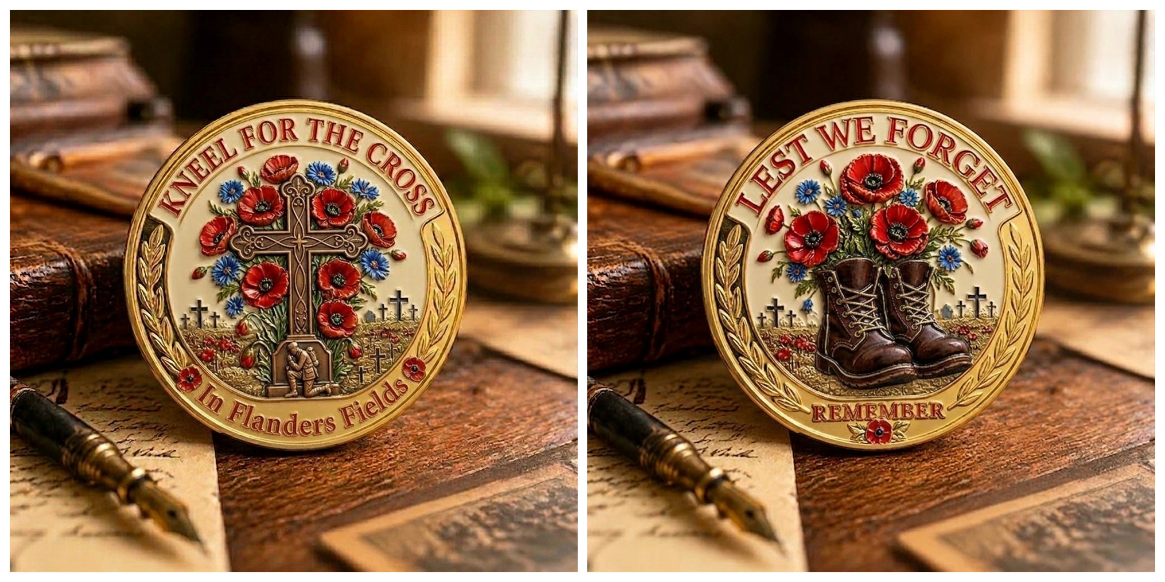 Side Two: Features the iconic red poppy flower, symbolizing remembrance and hope. The text "For All Our Fallen Heroes - We Will Remember Them" encircles the poppy, reinforcing our commitment to never forget their bravery.